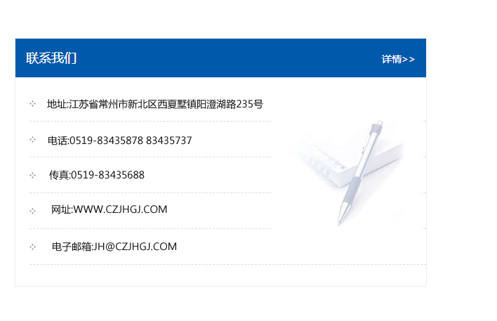 地址:常州市新北區友邦商務大廈1幢16、17層  電話:0519-85101652  傳真:0519-85112595  郵編:213022  網址:www_cz-jiayue_cn.yj-show.com  郵箱:xiajifengaa@163.com